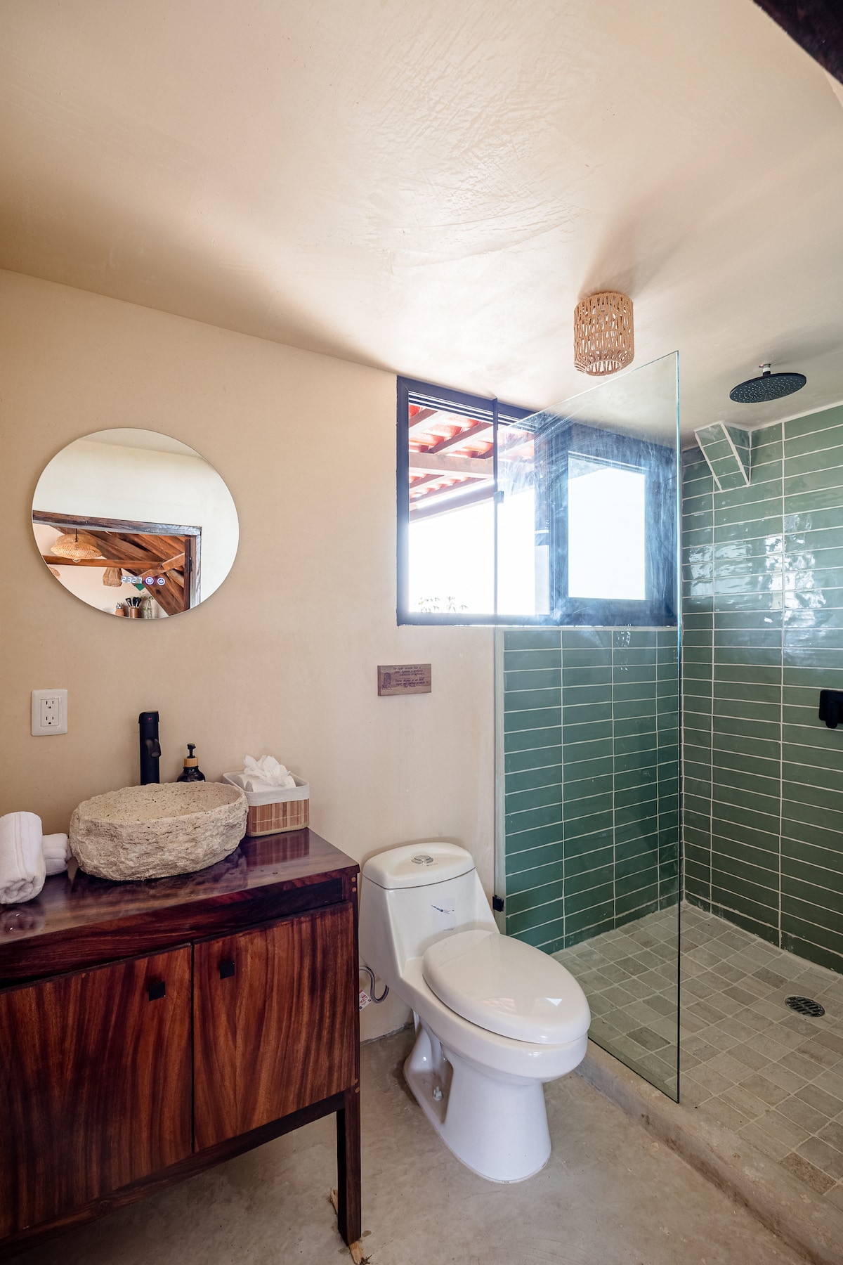 - Bathroom: A private bathroom with a large window offering ocean and tropical views from the shower—a truly unique touch.
